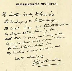 Nivedita died on 13 October 1911, aged 43, at Roy Villa, Darjeeling.[52] Today, her memorial is located below the Railway station on the way to the Victoria Falls (of Darjeeling)[53] with these words inscribed in her epitaph: "Here lies Sister Nivedita who gave her all to India".[6][52] Swami Vivekananda wrote a poem to Sister Nivedita, A benediction to Sister Nivedita. In this poem, Vivekananda condensed all his hopes, aspirations, and good wishes for his disciple,[54] Nivedita as The mistress, servant, friend in one to India's future son:[55]