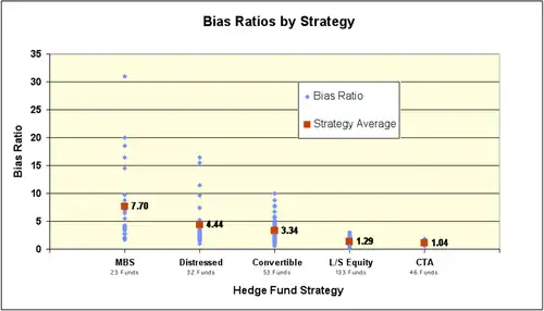 Strategies that employ illiquid assets can have bias ratios with an order of magnitude significantly higher than the bias ratios of indices representing the underlying asset class. For example, most equity indices have bias ratios falling between 1.0 and 1.5. A sample of equity hedge funds may have bias ratios ranging from 0.3 to 3.0 with an average of 1.29 and standard deviation of 0.5. On the other hand, the Lehman Aggregate MBS Index had a bias ratio of 2.16, while MBS hedge funds may have bias ratios from a respectable 1.7 to an astounding 31.0, with an average of 7.7 and standard deviation of 7.5.