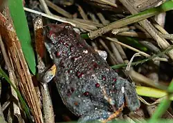 Bibron's toadlet or brown toadlet (Pseudophryne bibronii) is a species of Australian ground-dwelling frog that, although having declined over much of its range, is widespread through most of New South Wales, Victoria, south-eastern Queensland, and eastern South Australia, including Kangaroo Island.[2] Bibron's toadlet settles in a wide variety of habitats within these region but they mainly reside in dry forests, woodland, shrubland, grassland, coastal swamps, heathland, and sub-alpine areas.[3] They deposit their eggs in leaf litters during the flooding season, which is essential for the proper development of the egg. This species has high sexual dimorphism within the species and utilizes chemosignals to attract potential mates.