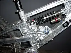 Another common seat stay variant is the wishbone, single seat stay, or mono stay,[26] which joins the stays together just above the rear wheel into a monotube that is joined to the seat tube. A wishbone design adds vertical rigidity without increasing lateral stiffness, generally an undesirable trait for bicycles with unsuspended rear wheels.[27] The wishbone design is most appropriate when used as part of a rear triangle subframe on a bicycle with independent rear suspension.