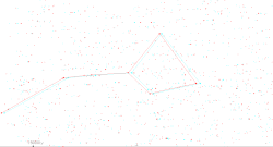 3D red cyan glasses are recommended to view this image correctly.Five of the stars of the Big Dipper are at the core of the Ursa Major Moving Group. The two at the ends, Dubhe and Alkaid, are not part of the swarm, and are moving in the opposite direction. Relative to the central five, they are moving down and to the right in the map. This will slowly change the Dipper's shape, with the bowl opening up and the handle becoming more bent. In 50,000 years the Dipper will no longer exist as we know it, but be re-formed into a new Dipper facing the opposite way. The stars Alkaid to Phecda will then constitute the bowl, while Phecda, Merak, and Dubhe will be the handle.