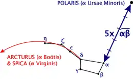 - By following the curve of the handle from Alioth (ε) to Mizar (ζ) to Alkaid (η), one reaches Arcturus (α Boötis) and Spica (α Virginis). A mnemonic for this is "Arc to Arcturus then speed (or spike) to Spica."