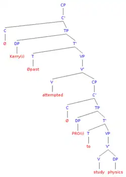 Within government and binding theory, the existence and distribution of PRO followed from the PRO theorem, which states that PRO may not be governed.[2] More recent analyses have abandoned the PRO theorem.[3] Instead, PRO is taken to be in complementary distribution with overt subjects because it is the only item that is able to carry null case which is checked for by non-finite tense markers (T), for example the English to in control infinitives.[4]