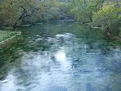Big Spring in Missouri is the largest spring in the Ozarks. Pictured here at 240 cu ft/s (6.8 m3/s) experiencing low flow after an extended dry period. | |