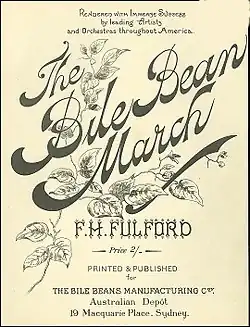 Among the more unusual marketing promotions undertaken by the Bile Beans Manufacturing Company was the "Bile Bean March", composed by Charles Fulford's older brother Frank Harris Fulford and first published in 1898.[6][24] The music was described as "a bold, spirited composition" in a 1902 newspaper report.[25] Readers could apply to receive a free copy of the sheet music by sending their address details to the company.[26] Another marketing ploy was the production of a cookery book,[24] which was also made widely available free of charge.[20] A Bile Bean Puzzle Book was published during the early 1930s and also freely distributed.[27] By that time, advertising for Bile Beans had become increasingly targeted at women, promising them health, bright eyes and a slim figure if taken regularly.[20]