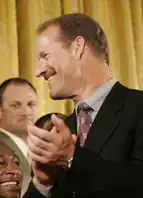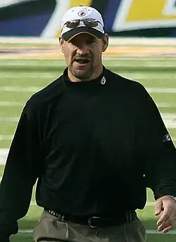 Unlike the stoic Noll, Cowher was known to be more fiery and emotional, specifically with his jaw line when he was angry and being known as "the Chin".[33] This was exemplified in a 1995 game against the Minnesota Vikings when the referees mistakenly penalized the Steelers for 12 men on the field following a missed field goal. The Vikings made the subsequent rekick despite Cowher's protests that they had the regulated 11 players on the field, and stuffed an "all-22" photo as proof into referee Gordon McCarter's pocket, leading to a $7,500 fine by the NFL for Cowher putting his hands on an official.[34] Cowher is also known for being a vocal supporter of the coaching profession in general and was upset that the Indianapolis Colts hired former center Jeff Saturday as interim head coach in 2022 despite having no coaching experience above the high school level and the team having several assistants already on the staff with previous head coaching experience.[35]