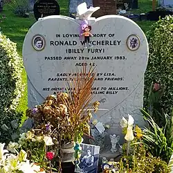 After returning from a recording session in the early hours of 28 January 1983, Fury collapsed from a heart attack at his home in London.[17] His manager, Tony Read, found him unconscious the next morning. He was taken to St Mary's Hospital in Paddington, but died in the afternoon, aged 42. Rheumatic fever, which he first contracted as a child, damaged his heart and ultimately contributed to his death.[5] A week after his death, a funeral service was held at the St John's Wood church in London, for which his body was embalmed by Desmond Henley.[18] Among the mourners were Larry Parnes, Marty Wilde, Jess Conrad, Eden Kane, Tony Read, Hal Carter and Mick Green, in addition to family members, friends and fans. The choir sang a special version of Billy's Decca hit "I'm Lost Without You". After the service Fury's body was buried at Mill Hill cemetery, in North London. A song issued posthumously entitled "Forget Him" became his final chart hit.