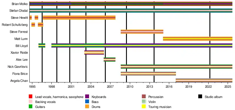 Hewitt left Placebo in 2007, due to personal and musical differences. He was replaced the following year by Steve Forrest.[5] Placebo released two albums with Forrest, who left in 2015 to pursue his own musical career. Since 2015, Placebo are officially a duo, though augmented with additional musicians.