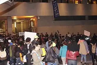 De Blasio gained media attention during the campaign when he and a dozen others, including city councillor Stephen Levin, were arrested while protesting the closing of Long Island College Hospital.[62] De Blasio and Levin were released a few hours later with disorderly conduct summonses. Fellow Democratic mayoral hopefuls Weiner and City Comptroller John Liu were also at the protest but were not arrested.[63]