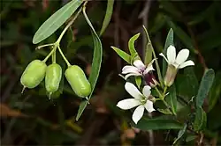 Sweet apple-berry grows in mallee and eucalypt woodland in the south-east of South Australia and western Victoria. Subspecies cymosa is found on the Yorke Peninsula and in the Southern Lofty and Murray Basin areas, extending into the Wimmera region of western Victoria.[9][10] Subspecies pseudocymosa mainly occurs on the Eyre Peninsula but also in parts of the Eyre Peninsula with subsp. cymosa, and on the northern plains of Victoria from Wyperfeld to Mildura.[12][13]