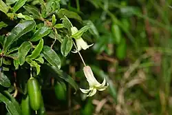 Billardiera mutabilis, commonly known as climbing apple berry, apple berry, snot berry, apple dumplings or changeable-flowered billardiera,[2] is a species of flowering plant in the family Pittosporaceae and is endemic to south-eastern Australia. It is a slender climber or twiner with narrowly elliptic leaves and bell-shaped, greenish-yellow flowers that turn bluish as they age.