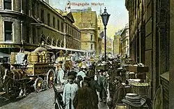 Billingsgate Wharf, close to Lower Thames Street, became the centre of a fish market during the 16th and 17th centuries but did not become formally established until the Billingsgate, etc. Act 1698 (10 Will. 3. c. 13)[a].[2]