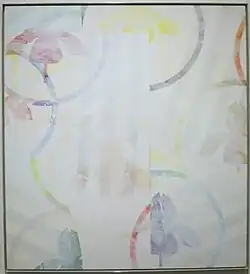 Thomas E. Crow drew attention to the deliberate contrast between Bengston's flamboyant, competitive, aggressively masculine stance and his delicate, modest approach to his art.[10] Silhouettes of iris flowers, for instance, figure prominently in Bengston's paintings. In the 1960s, he often painted a single centrally placed flower (as he also did with the chevron), thus upending the widely held notion that putting an object in the center of a canvas should be avoided at all costs. "I've been doing that ever since year one", he said of this practice, "ever since I learned you shouldn't do it."[15] During the 1970s, Bengston began using multiple iris silhouettes, often surrounded by overlapping circles, as in Canopus Dracula (1977) in the collection of the Honolulu Museum of Art.[16]