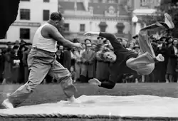 By the end of June a title match between Meeske and the reigning heavyweight champion Clarence Weber had been scheduled for July 10, and there was an immediate heavy demand for bookings.[155] Emphasis was placed on the fact Meeske had improved from their last bout by enhancing his technique in America in the leadup to the match,[156] although general sentiment was reportedly that Weber would retain the title.[157] The two wrestlers attracted a large crowd just for a demonstration session in which they demonstrated wrestling holds ahead of the match.[158] They wrestled on July 11 and it was an even match until Meeske was disqualified for knocking Weber out with a punch to the jaw after which Weber's camp invaded the ring and Meeske was heckled as he fled to his dressing room protected by several police constables,[159] with Weber receiving loud cheers when he came to.[160] After the match Meeske claimed the blow was accidental and said he would wrestle Weber again any time.[161] The crowd reaction to the Weber-Meeske match was described as unprecedented[162] and prompted the manager of the stadium where the match took place to launch an inquiry,[161] during which fellow wrestlers Mike Yokel and Martin Ludecke explained that such blows easily occur in wrestling by accident, with Yokel showing injuries to prove it.[163] Weber also stated that Meeske had apologized to him and asked for leniency.[164] It was concluded that Meeske could retain his share of the gate money,[163] with the manager of Stadiums Ltd. publicly warning Meeske to avoid roughness in future.[165]