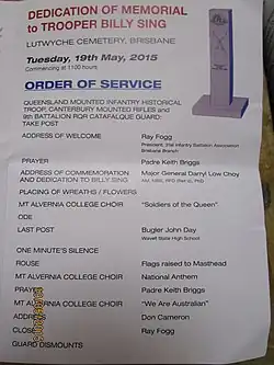 The Queensland Military Historical Society set up a bronze plaque at 304 Montague Road, South Brisbane, where Sing had died.[33][58] In 1995, a statue of Sing was unveiled with honour in his home town of Clermont.[33] In 2004, an Australian Army sniper team in Baghdad named their post the 'Billy Sing Bar & Grill.'[33] On 19 May 2009, the 66th anniversary of Sing's death, the Chinese Consul-General, Ren Gongping, along with Returned and Services League of Australia officers and community leaders, laid wreaths at his grave.[8][33][63] Ren said, "Billy Sing is a symbol of the long history of Chinese in Australia, and the great role they have played in your nation's past ... It also reminds us that China and Australia were allies through both world wars, and that we have a long and proud shared past."[8]