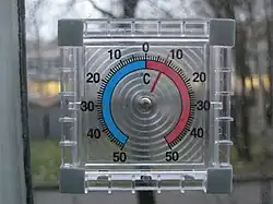 A bimetallic strip or bimetal strip is a strip that consists of two strips of different metals which expand at different rates as they are heated. The different expansion rates cause the strip to bend one way if heated, and in the opposite direction if cooled below its initial temperature. Thus, a bimetal strip converts a temperature change into mechanical displacement. The metal with the higher coefficient of thermal expansion is on the outer side of the curve when the strip is heated and on the inner side when cooled. Common applications include temperature sensing (thermometer) and regulation (thermostat).