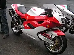 The following year, Bimota entered a Tesi 500, powered by a 500cc two-stroke V-twin engine, a precursor to the V-Due.[30] The fuel injection system was linked to an ECU, which adjusted the fuel supply based on air temperature, coolant temperature, exhaust gas temperature, and airbox pressure. Fuel was injected at the optimal moment when the exhaust port was fully closed. This engine produced 124 horsepower and was mounted on a standard Tesi frame. The rear disc brake was increased to 210mm, and the exhaust silencers were made from carbon fiber.