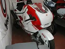 The first prototype was presented at the Milan Motorcycle Show in 1983. At that time, it was powered by a Honda VF 400 F engine, and its frame was a carbon fiber monocoque positioned under the engine.[8] The bike had a futuristic design[9] and introduced a hydraulic steering system known as DCS (Dive Control System). This system used two pistons: one on the left side of the wheel and another under the handlebars. When the rider turned the handlebars right, the second piston pushed hydraulic fluid through a hose, compressing the wheel piston. When turning left, the fluid was directed into a second hose, causing the wheel piston to extend.[10]