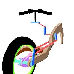 The front and rear swingarms are connected by an omega-shaped frame. The wheel hub houses two tapered bearings and an axle, which is connected via a linkage system to a small steering column located against the frame on the left side of the bike. Another linkage connects this column to the lower triple clamp and clip-on handlebars.[5]
