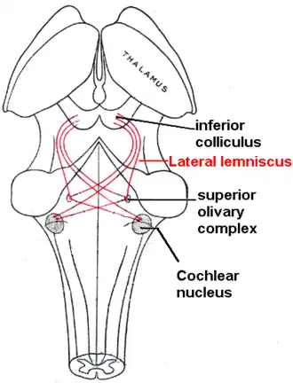 In vertebrate mammals, as sound waves travel via the eardrum, through the cochlea in the inner ear, they stimulate the hair cells that line the basilar membrane.[5] Using these hair cells, the cochlea converts auditory information at each ear into electrical impulses, which travel by means of the auditory nerve (AN) from the cochlea to the cochlear nucleus (CN), which is located in the pons of the brainstem.[6] From the ventral CN (VCN), nerve signals project to the superior olivary complex (SOC), a set of brainstem nuclei that consists primarily of two nuclei, the medial superior olive (MSO) and the lateral superior olive (LSO), and is the primary site of binaural fusion. The subdivision of the VCN that concerns binaural fusion is the anteroventral cochlear nucleus (AVCN).[3] The AVCN consists of spherical bushy cells and globular bushy cells and can also transmit signals to the medial nucleus of the trapezoid body (MNTB), whose neurons project to the MSO. Transmissions from the SOC travel to the inferior colliculus (IC) via the lateral lemniscus. At the level of the IC, binaural fusion is more complete. The signal ascends to the medial geniculate body (MGC) of the thalamocortical system; sensory inputs to the MGB are then relayed to the primary auditory cortex.[3][7][8][9]