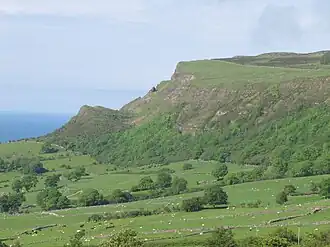 Binevenagh (from Irish Binn Fhoibhne, meaning 'Foibhne's peak')[1] is a large, steep-sided hill in County Londonderry, Northern Ireland. It is part of the Keenaght Hills,[2] which mark the western edge of the Antrim Plateau, formed around 60 million years ago by molten lava. Binevenagh and its cliffs overlook the Magilligan peninsula and dominate the skyline over the villages of Bellarena, Downhill, Castlerock and Benone beach. The area has been classified as both an Area of Special Scientific Interest[3] and as an Area of Outstanding Natural Beauty (AONB).[4] The total area of the AONB is 138 km2.
