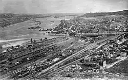 On 17 October 1859, both stations were connected by a bridge. Bingerbrück station therefore became a border station on the former border between the Kingdom of Prussia and the Grand Duchy of Hesse. On 15 December 1859, the Koblenz–Bingerbrück section of the left bank was opened by Rhenish Railway Company (Rheinische Eisenbahn-Gesellschaft). In order to improve the carriage of freight from the Saar region to the region of Wiesbaden and Frankfurt, the Rhine-Nahe Railway (Rhein-Nahe-Eisenbahn, the owner of the Nahe Valley Railway) and the Nassau State Railway (Nassauische Staatsbahn) decided to set up the Bingerbrück–Rüdesheim train ferry for freight wagons. This ferry went into operation on the Rhine between Bingerbrück and Rüdesheim on 1 September 1862. In 1900, operations were discontinued and some years later it replaced by the Hindenburg Bridge. This railway bridge, connecting Bingerbrück and Rudesheim, was built in the years 1913 to 1915 and destroyed during the Second World War. Since then there has been no way for trains to cross the Rhine near Bingen.