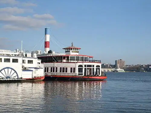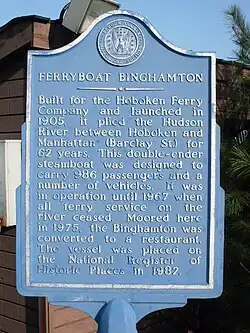 The Binghamton was a ferryboat that transported passengers across the Hudson River between Manhattan and Hoboken from 1905 to 1967. Moored in 1971 at Edgewater, Bergen County, New Jersey, United States, the ship was operated as a floating restaurant from 1975 to 2007.[4] In 2017, following ten years of damage that effectively rendered the boat unrestorable, the ferry was dismantled. No structural components were salvaged.[5]