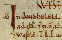 m In Bingheleia hb. Gospatric iiij car' tra e' ad gld. tra ad ii car' Ernegis de burun h't. & Wast' e'. T.R.E. val, iiij lib'. Silva past' ii leu' lg' & i lat'. Tot' m' e iiij leu' lg' & ii lat'[4]
