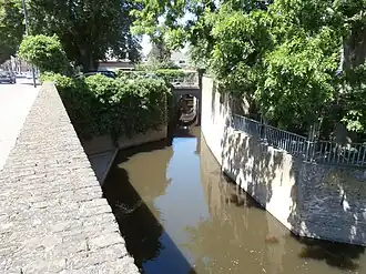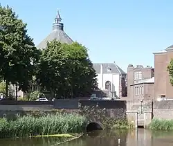 The Kerkstroom is named for flowing under the choir of St. Catherine's Church. It is a short natural stream that exits into the Kleine Vughterstroom.[12] From the city moat there are two entrances to the Kerkstroom. Both are called Kruisbroedershekel. The old Kruisbroedershekel was rather narrow, but nevertheless required a 'Hekel' to close it. It was only in 1880 that it was transformed into a sluice. The new Kruisbroedershekel dates from 2002, and was made to (again?) give boats access to the Kerkstroom. From a low hole in the wall west of the old Hekel, a corridor starts through the walls. Inside a room was made which shows the fourteenth-century second city wall and a 16th-century gate which was found during construction.[13] The corridor continues to exit in the Kerkstroom just behind the wall.