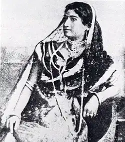 Binodini Dasi was born into a poor family. As a child, she followed tawaif Ganga Bai to learn music, accompanied her during music sessions. She was nine when she saw a play for the first time. Awe-struck by the stage, Binodini Dasi expressed her desire to act.[7] She started her career as a tawaif, and at age of twelve, she played her first professional stage role at Calcutta's National Theatre in 1874, under the mentorship of its founder, Girish Chandra Ghosh.[8][9] Her career coincided with the growth of proscenium-inspired European theatre among the Bengali theatre going audience. During a career spanning twelve years, she enacted over eighty roles, which included those of Pramila, Sita, Draupadi, Radha, Ayesha, Kaikeyi, Motibibi, and Kapalkundala, among others. She was one of the first South Asian theatre actresses to write her own autobiography. Her sudden retirement from the stage is insufficiently explained. Her autobiography has a consistent thread of betrayal. She defied every canon of feminine smritikatha and wrote down what amounted to her indictment of respectable society. Ramakrishna, the great saint of 19th century Bengal, came to see her play in 1884.[10] She was a pioneering entrepreneur of the Bengali stage and introduced modern techniques of stage make-up through blending European and indigenous styles.