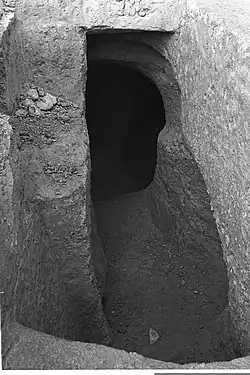 31°14′01.5″N 34°46′31″E / 31.233750°N 34.77528°EBir Abu Matar is an archaeological site in the Valley of Beersheba that contains remains dated to the Chalcolithic period. It is located on the northern bank of the Beersheba Creek, on the southern outskirts of Beersheba in the Negev desert of southern Israel, at a location where water could probably have been obtained by digging wells.[1] The culture discovered on this site and on a number of other sites in the Valley of Beersheba was named the Beersheba Culture. The settlements existed between c-4200 and c-4000 BC.[2] The earth in this area is soft loess. One of the characteristics of the site, during the early phase of its settlement, was the construction of underground dwellings, dug in the earth. The site was first discovered and surveyed by David Alon, an Israeli archaeologist, in 1951. It was excavated by the French archaeologist, Jean Perrot, between 1951 and 1960. Rescue excavations were carried out in Bir Abu Matar in the 1980s and in the early 1990s. A small park was later built on top of the site, which is now situated at the southernmost edge of Na'veh Ze'ev borough, in Beersheba.[3]