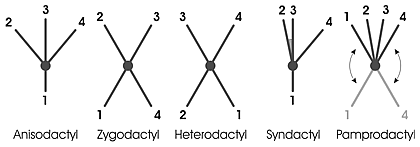 - Pamprodactyl: two inner toes in front (2, 3), the two outer (1, 4) can rotate freely forward and backward. In mousebirds and some swifts. Some swifts move all four digits forward to use them as hooks to hang.[20]