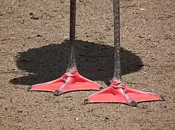 The bird knee joint between the femur and tibia (or rather tibiotarsus) points forwards, but is hidden within the feathers. The backward-pointing "heel" (ankle) that is easily visible is a joint between the tibiotarsus and tarsometatarsus.[3][4] The joint inside the tarsus occurs also in some reptiles. It is worth noting here that the name "thick knee" of the members of the family Burhinidae is a misnomer because their heels are large.[2][8]