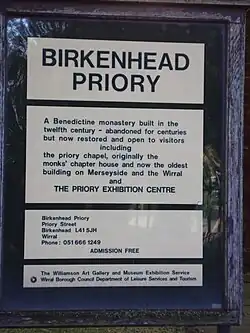- ^ a b Wirral Borough Council: Birkenhead Priory, Metropolitan Borough of Wirral, archived from the original on 19 June 2010, retrieved 18 June 2010