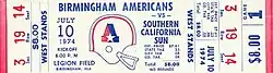 The Americans' first game was played on July 10, 1974, against the Southern California Sun in front of a crowd of 53,231 at Legion Field.[21] (The announced attendance of 53,231 was inflated. The actual attendance figure was 43,031 for the opening game, of which 41,799 had paid.)[22][23] Held scoreless by the Sun for the first three quarters and trailing by a touchdown at the start of the fourth quarter, the Americans came back to win 11–7.[24] In their first road game, the Americans overcame a 26-point deficit at halftime to win 32–29 over the New York Stars in front of 17,943 at Downing Stadium on July 17, 1974.[25] The second home game, a 58–33 win over the Memphis Southmen on July 24, drew an announced attendance of 61,319 fans (actual attendance was 54,413 with 40,367 paying).[22][23][26][27]