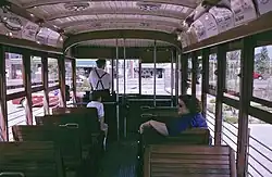 Like many streetcars, car 224 is a "double-ended"[11] car – capable of being operated from either end. It has a single door on each side. The backs of its wooden-bench seats are reversible, allowing the seats to face either end of the car. This type of seat was also known as a "walkover" seat,[6] as the motorman could walk down the car's center aisle at the end of the line and flip the backs of the seats over. The 600 Volts DC that powers the car's electric motor is collected from the overhead trolley wire via a trolley pole on the roof; only one of the two poles is in use at a time, depending on the direction of travel. The car has a single truck and, overall, is approximately 27 feet (8.2 m) long.[9]