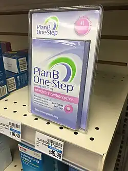 In 1997, the FDA approved a prescription emergency contraception pill (known as the morning-after pill), which became available over the counter in 2006.[53] In 2010, ulipristal acetate, an emergency contraceptive which is more effective after a longer delay was approved for use up to five days after unprotected sexual intercourse.[54] Fifty to sixty percent of abortion patients became pregnant in circumstances in which emergency contraceptives could have been used.[55] These emergency contraceptives, including Plan B and EllaOne, became another reproductive rights controversy.[56] Opponents of emergency contraception consider it a form of abortion, because it may interfere with the ability of a fertilized embryo to implant in the uterus; while proponents contend that it is not abortion, because the absence of implantation means that pregnancy never commenced.[57]