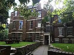The oldest part of the college site is likely what is now the dining room, believed to date back to the 17th century.[2] It originally formed part of a town house owned by a wealthy member of local society, and was converted in 1760 into a coaching inn, The Red Lion – a stopping point for coaches travelling between London and Edinburgh.[22] During this time it also hosted concerts, probably featuring the work of composers like Charles Avison and John Garth.[34] In 1799 the old coaching inn reverted to being a private residence.[22] In 1845, it was sold to the university, and emerged as the first component of the newly founded Hatfield College the following year.[2] Much more extensive when first occupied by Hatfield, since then "substantial parts of the building" have been replaced by newer structures.[22] Apart from the dining room, what remains are spaces adjoining it that were once used by travellers, but are now filled by the Senior Common Room (SCR) – formerly a card room – the SCR dining room; and finally, on the higher floors, the 'D Stairs' student accommodation block, which comprises 13 twin rooms.[22][35] D Staircase has had a reputation for being haunted by a female spirit, recognisable by the aroma of a distinctive perfume.[36]