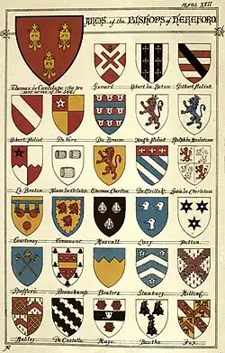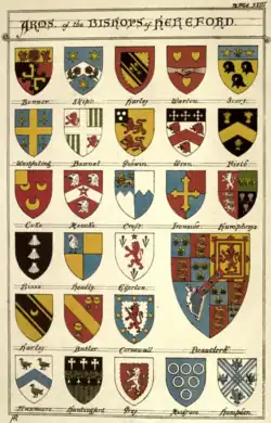 Knowledge of the coats of arms of Bishops of Hereford is necessary for the identification of the patrons or instigators of building works, manuscripts, stained glass windows and other art-works, which frequently bear heraldic imagery with no further identifying marks. The following list of the blazons of the arms of the Bishops of Hereford (with his sources) was compiled by Rev. Francis T. Havergal (Vicar-Choral and Sub-Treasurer of Hereford Cathedral) in his Fasti Herefordenses of 1869;[31] all arms before the start of the age of heraldry (c.1200-1215) are attributed arms, some, like de Vere, being the arms later adopted by his family: