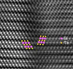 Bismuth telluride is a narrow-gap layered semiconductor with a trigonal unit cell. The valence and conduction band structure can be described as a many-ellipsoidal model with 6 constant-energy ellipsoids that are centered on the reflection planes.[4] Bi2Te3 cleaves easily along the trigonal axis due to Van der Waals bonding between neighboring tellurium atoms. Due to this, bismuth-telluride-based materials used for power generation or cooling applications must be polycrystalline. Furthermore, the Seebeck coefficient of bulk Bi2Te3 becomes compensated around room temperature, forcing the materials used in power-generation devices to be an alloy of bismuth, antimony, tellurium, and selenium.[5]