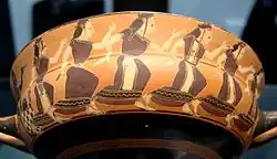 Starting around the second third of the 6th century BC, Attic artists became interested in mythological scenes and other representations of figures. Animal friezes became less important. Only a few painters took care with them, and they were generally moved from the center of attention to less important areas of vases. This new style is especially represented by the François vase, signed by both the potter Ergotimos and the painter Kleitias (570–560 BC). This krater is considered to be the most famous Greek painted vase.[22] It is the first known volute krater made of clay. Mythological events are depicted in several friezes, with animal friezes being shown in secondary locations. Several iconographic and technical details appear on this vase for the first time. Many are unique, such as the representation of a lowered mast of a sailing ship; others became part of the standard repertoire, such as people sitting with one leg behind the other, instead of with the traditional parallel positioning of the legs.[23] Four other, smaller vases were signed by Ergotimos and Kleitias, and additional vases and fragments are attributed to them. They provide evidence for other innovations by Kleitias, like the first depiction of the birth of Athena or of the Dance on Crete.