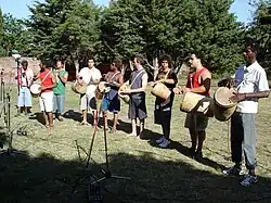 Argentine murga has considerable influence from candombe and other African musical influences.[56] Murga porteña places a considerable emphasis on dance and instrumentals, more so than lyrics (in contrast to Uruguayan murga). Performances take place in the form of parades (known as corsos) across the various neighbourhoods of Buenos Aires; some groups feature not only dancers and musicians but also jugglers, stilts, flagbearers, and other types of visually stimulating elements. Corsos take place throughout the year, but are recurrent during carnival season in February.[57]