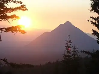 Black Butte (formerly Wintoon Butte, Cone Mountain, Sugar Loaf and Muir's Peak[5]) is a cluster of overlapping dacite lava domes in a butte,[2] a satellite cone of Mount Shasta.[6] It is located directly adjacent to the northbound lanes of Interstate 5 at milepost 742 between the cities of Mount Shasta and Weed, California. The I-5 freeway crosses a 3,912 ft (1,192 m) pass, Black Butte Summit, at the western base of the lava domes. The lava domes were extruded at the foot of the cone of Shastina following the period of its major eruptions about 9,000–10,000 years ago.[2]