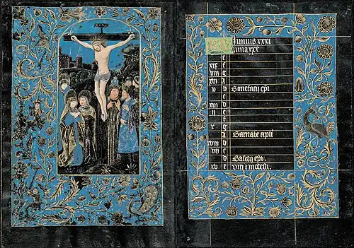 The Black Hours, MS M.493 (or the Morgan Black Hours) is an illuminated book of hours completed in Bruges between 1460 and 1475.[1] It consists of 121 pages (leaves) with Latin text written in Gothic minuscule script. The words are arranged in rows of fourteen lines and follow the Roman version of the texts. The lettering is inscribed in silver and gold and placed within borders ornamented with flowers, foliage and grotesques, on pages dyed a deep blueish black; hence its designation as a Black books of hours. The book contains fourteen full-page miniatures and opens with the months of the liturgical calendar (folios 3 verso – 14 recto), followed by the Hours of the Virgin, and ends with the Office of the Dead (folio 121v).