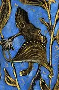 The opening letters of each prayer are formed from gold leaf on green ground.[2] Their texts contain words from the Hours of the Cross, the Hours of the Holy Spirit, the Mass of the Virgin, the Hours of the Virgin, the Penitential Psalms, and the Office of the Dead.[12] The lettering is in Gothic minuscule with silver ink, with gold leaf added to the rubrics.[5][12] The border decorations include landscapes, jagged acanthus scrolls, birds, small animals and grotesques; the latter are similar in style to those found in the Black Hours of Galeazzo Maria Sforza, and include naked winged devils and hybrid men.[17] They are ornamented exclusively in gold and are shaded mostly by black pigment. They are lined with yellow or gold filigree and extravagant foliage, including vines.[11] The manuscript has deteriorated over time and has flaked in some areas.[1]