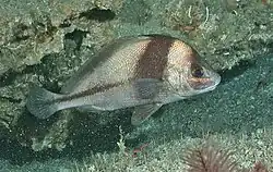 The blackbar drum has a deep, rhomboid body with an arched dorsal profile. The head is low, with a moderately large eye and a snout protruding beyond the mouth, with a notched upper jaw which encloses the lower jaw. The villiform teeth are arranged in bands with those in the outer row of the lower jaw being enlarged and resembling canine teeth. There are no barbels on the chin but there are five pores and there are ten pores on the snout. The preoperculum has weak serrations. The long based dorsal fin has a deep notch separating the spiny and soft-rayed parts with between eight and ten spines before the notch and a single spine and between 37 and 41 soft rays behind it. The spiny part is tall with the sixth spine being the longest. The anal fin is supported by two spines, the second spine being quite thin, and seven soft rays. The scales of the body are ctenoid while those on the head are cycloid, and there are thick coverings of scales on the bases of the soft-rayed part of the dorsal and anal fins. This species has a maximum published total length of 20 centimetres (7.9 inches). The overall color is gray with a wide black bar running from the dorsal fin to the pelvic fin and a thinner dark stripe running horizontally along the flank. The fins are dark. Juveniles are whiter in color with a slender black bar down the middle of the snout and another between the eyes with the same stripes on the body as the adults.[7] As individuals grow larger the pattern of stripes on the body becomes less distinct.[2]