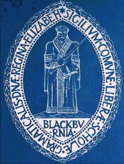 | School Seal | Latin: SIGILIUM COMUNE LIBERAE SCHOLAE GRAMATICALIS DNAE REGINA ELIZABETH BLACKBURNIA Common seal of Queen Elizabeth's free grammar school Blackburn |