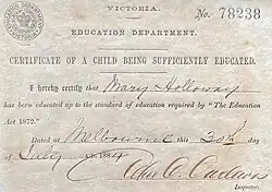 Education in Victoria, Australia is supervised by the Department of Education and Training, which is part of the State Government and whose role is to "provide policy and planning advice for the delivery of education".[1] It acts as advisor to two state ministers, that for Education and for Children and Early Childhood Development.