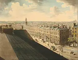 The Rotunda building had a central circular gallery and in brick; the roof was conical and in slate.[2] It was located on the south side of the Thames, and at the time was in the county of Surrey. The dimensions were later given as 120 feet by 132 feet, i.e. 1760 square yards;[3] originally the area was under 1000 square yards, however.[1] It was located on Great Surrey Street, fronting on the Georgian terrace there (and was only later properly known as 3 Blackfriars Road, the street name being changed in 1829[4]). The layout is believed to be documented only by a single surviving sketched floor plan.[5]