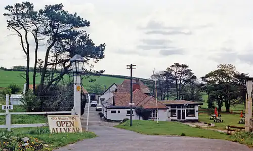 At a crossroads and coaching stage, the station was provided with a range of stables, since converted to human habitation. The station building has been extended over the trackbed, in a sympathetic style, and is now a licensed restaurant. The bridge under the crossroads has been filled in.